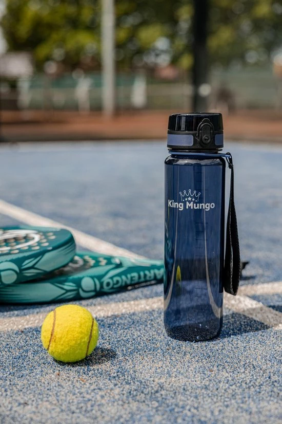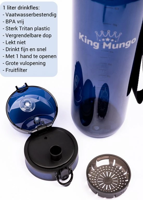 Hoge kwaliteit drinkfles 1 liter, lekvrij en zeer comfortabele grote 1 liter drinkfles / bidon / drinkbus voor dagelijks gebruik of als sportfles van hard Tritan plastic. Met unieke lekvrije dop die met 1 hand snel te openen is. Een uniek sluitmechanisme, vergrendel de dop zodat de grote waterfles niet lekt in je tas. Deze herbruikbare en dus duurzame donkerblauwe King Mungo 1000 ml design waterflessen zijn BPA vrij (veilig en geen plastic smaak aan het water).