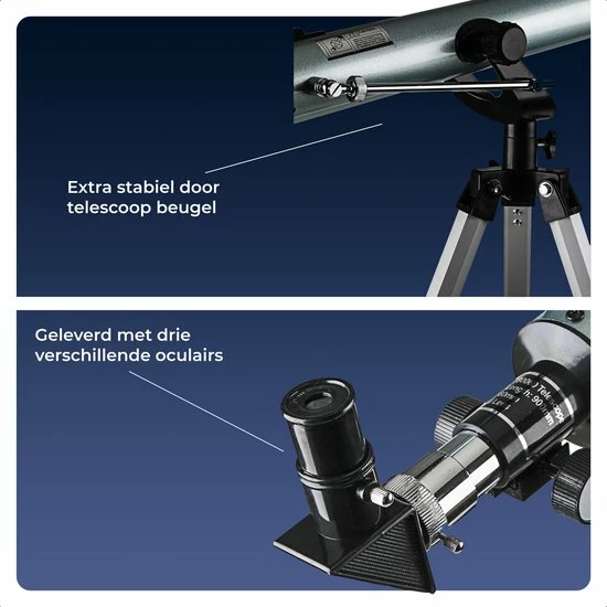 De sterrenkijker wordt geleverd in een set, die veel meer bevat dan alleen een telescoop. Zo ontvang je drie standaard lenzen (25mm, 10mm en 6mm) en een 3x barlow lens, die zorgt voor een extra grote vergroting. Ook bevat de set een finder scope die helpt bij het vinden van planeten. Naast de verschillende lenzen wordt deze telescoop set geleverd met een smartphonehouder. Wanneer je jouw telefoon hierin plaatst maak je eenvoudig de mooiste foto’s van de sterren en planeten waar je op dat moment naar kijkt. Uiteraard wordt dit alles compleet gemaakt door een stevig statief. De telescoop kan eenvoudig op het statief wordt geplaatst, die ook nog eens in hoogte verstelbaar is. Dit alles kan gemakkelijk en veilig worden opgeborgen in de meegeleverde opbergtas.