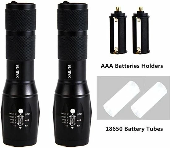 - 2x Besjaar Militaire LED Zaklampen + 6 AAA Alkalinebatterijen!