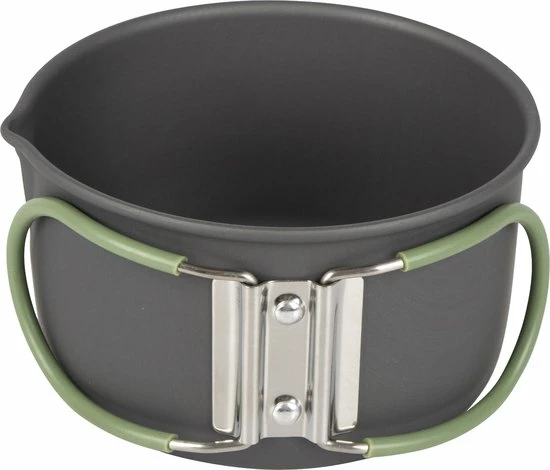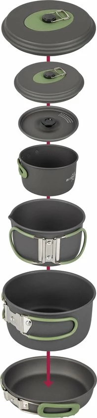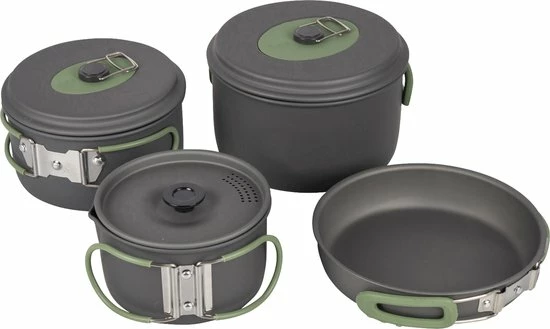 Een complete 4-delige lichtgewicht kookset. Deze pannenset bestaat uit 3 kookpannen met een deksel en een koekenpan. Bij uitstek geschikt voor outdoor gebruik. Te gebruiken op de warmtebronnen gas, keramisch, benzine en elektrisch. Gemaakt van stevig hard geanodiseerd aluminium, waardoor er een vermindere kans is op aanbakken. Iedere pan is voorzien van een hittebestendige siliconen klapgreep. Deze handgrepen kunnen na gebruik eenvoudig om de pan worden geklapt zodat de pannen compact op te bergen en vervoeren zijn. Inclusief foedraal. Uitermate geschikt voor kleine kooktoestellen, voor 1-2 personen.