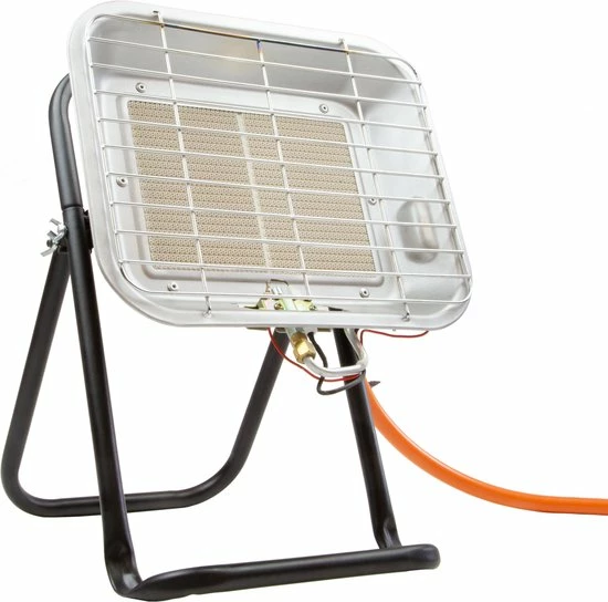 Beschrijving Infrarood straler 4,5 kW + ODS: Makkelijk te monteren op statief of montage aan de muur / wand. Met ODS beveiliging (oxygen Depletion System) – Waakvlam stand – Thermisch beveiligd – Met piezo ontsteker – Compleet met 150 cm gasslang en drukregelaar 30 mbar – Werkzaam op butaan, propaan, LPG – Max. vermogen 4,5 kW 4500 Watt – Gas verbruik max. 330 gram/uur – Afmetingen brander : 29 x 24 cm – Eenvoudig los van de standaard te schroeven – De statief kan eenvoudig gemonteerd worden aan de muur. De infrarood straling geeft voor binnen en buiten genoeg convectie warmte, convectie warmte is stijgende ruimte vullende warmte.
