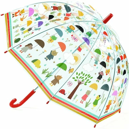 Dankzij deze transparante paraplu stap je met veel plezier naar buiten als het regent … en je bent nooit alleen want dit fijn kinderaccessoire is versierd met kleurrijke poppetjes met hun eigen paraplu. Lekker vrolijk, bont van kleur en helemaal op kindermaat! Doorzichtige kinderparaplu In de regen met knappe illustraties komt uit de Little Big Room collectie van Djeco – met rode kunststof handvat en handig knopje om makkelijk en snel de paraplu te openen.