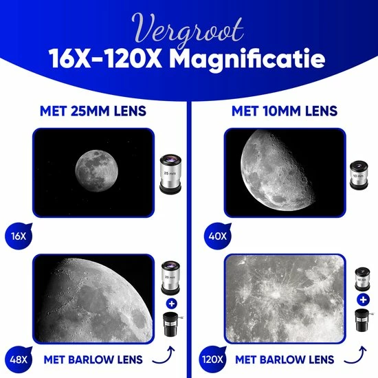 Met de 25mm lens heb je dus een magnificatie van 16x (400/25) en 48x met de Barlow Lens (16×3). Deze magnificaties zijn ideaal voor de beginnende sterrenkijker. Mocht je naar verloop van tijd een grotere magnificatie willen dan hoef je niet een geheel nieuwe telescoop aan te schaffen. Je kan dan namelijk ook enkel een andere lens kopen. Deze zijn los verkrijgbaar in ons assortiment.