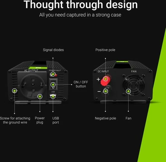 Deze Green Cell omvormer biedt 1000 W continu vermogen en 2000 W piekvermogen. Het beschikt over een universele aansluiting die compatibel is met stekkers die in het grootste deel van de wereld worden gebruikt. Met zijn 1AC-uitgang en 1 USB-poort, kunt u uw apparaten gemakkelijk opladen. De 12V tot 220V is handig voor de meeste autos, campers, vrachtwagens en vrachtwagens. Het is volledig compatibel met uw smartphones, tablets, voedingen, computers, LED-lampen, laptops, koelkasten, tv-toestellen, zonnepanelen-verwarmingspompen en vele andere dagelijkse elektronica. Als bonusadvies van ons, zorg ervoor dat het totale vermogen dat u op een omvormer zet niet meer is dan 85% van het nominale vermogen; dit verlengt de levensduur van de omvormer. Dit product is gemaakt van een hoogwaardige aluminiumlegering die bestand is tegen mechanische schade en schokken, maar die de omvormer zeer licht in gewicht maakt. Deze Green Cell Inverter heeft een stabiele stroomvoorziening, LED-licht dat de werkstatus aangeeft en een ingebouwde koelventilator die warmte en tekorten vermindert. Bij aankoop van dit product, geniet u van een garantie van 24 maanden en kunt u deze binnen 30 dagen na aankoop aan ons retourneren voor een volledige terugbetaling van het aankoop bedrag.