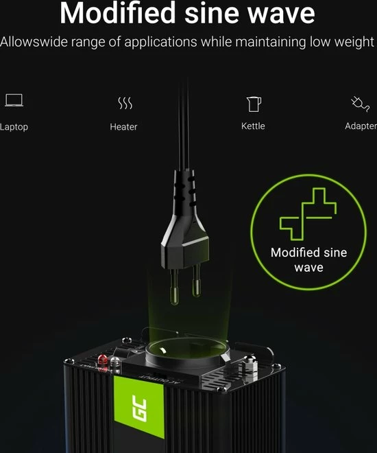 Gemodificeerde sinusomvormers zijn perfect voor het aansluiten van apparaten zoals laptopvoeding of telefoonoplader. Als u echter bijvoorbeeld een magnetron, waterkokers, koelkast of waterpomp of ander inductiemotorapparaat wilt laten werken, is het noodzakelijk om een omvormer met een zuivere sinusgolf te gebruiken. Een gemodificeerde sinus zal dan ook enkel met een bepaalde reeks apparaten werken. Een zuivere sinus zal met elk apparaat werken. Bij twijfel of jou apparaat wel op een gemodificeerde zal werken kan je altijd contact met ons opnemen.