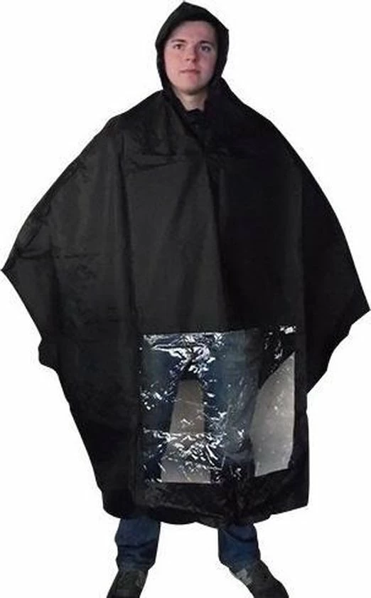 Deze fiets poncho is eenvoudig aan te trekken en aan de voorzijde voorzien van een transparante overlap. Deze zorgt ervoor dat de poncho over het stuur heen gehangen kan worden zonder dat daarbij de koplamp verduisterd. Aan de binnenzijde zijn twee elastieken lussen om de handen door te steken om opwaaien te voorkomen. De zwarte regenponcho fiets is vervaardigd uit waterdicht PVC en heeft drukknopen rondom de hals. Deze Sport-Plein regenponcho is in één maat leverbaar, “One-size-fits-all”.