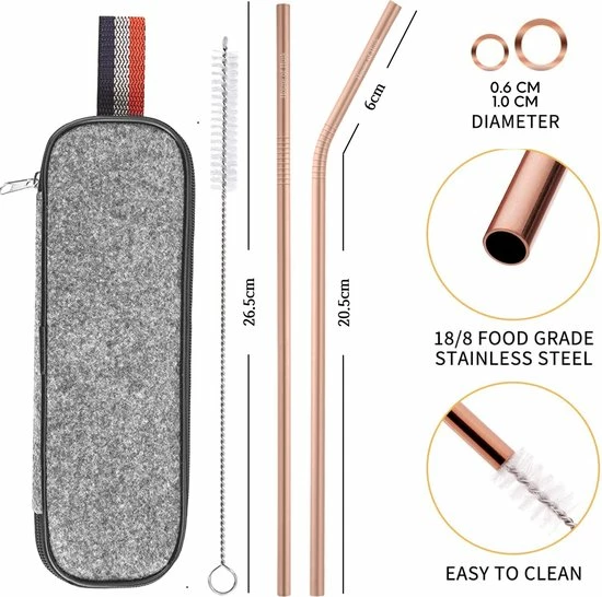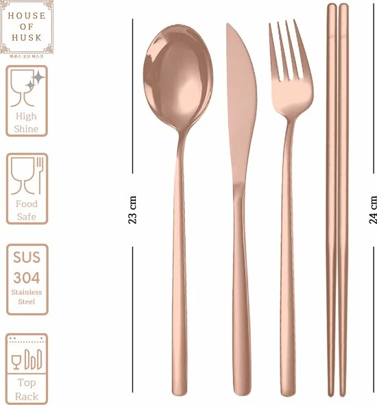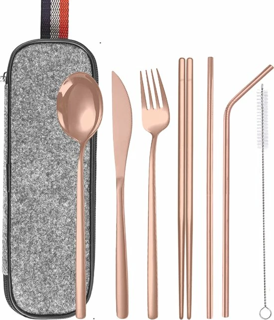 Inhoud: 1x Lepel, 1x Vork, 1 Mes, 1 paar Eetstokjes, 2x Herbruikbare Rietjes, 1x Reinigingsborstel Rietjes, 1x Opberghoes