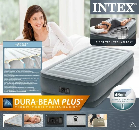 Door de Fiber-Tech Technologie in combinatie met de zachte toplaag én de hoogte van 46 cm ligt dit Intex Comfort-Plush Luchtbed extra comfortabel voor een goede nachtrust.