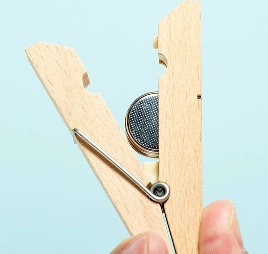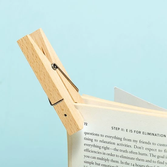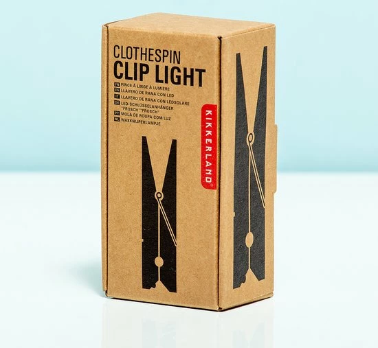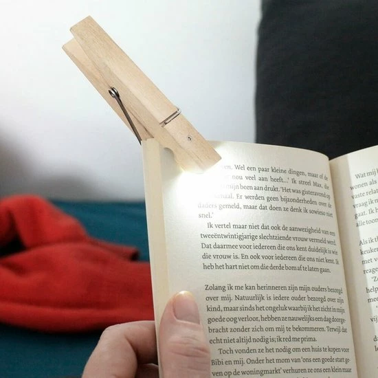 Wasknijper clip light van Kikkerland. Lampje in de vorm van een wasknijper, die je op een boek kunt clippen. De wasknijper is gemaakt van hout en is voorzien van een LED-lampje. Het is een ideaal leeslampje voor in bed, zonder dat iemand anders las heeft van het licht. Ook leuk en handig om mee te nemen op vakantie, als je bijvoorbeeld tijdens het kamperen nog wilt lezen. Het wasknijper lampje werkt op twee CR2032 batterijen (inbegrepen).