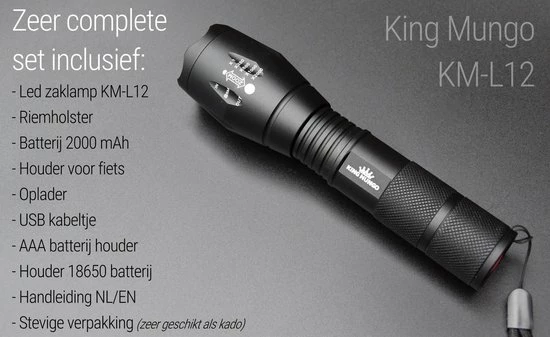 Militaire led Zaklamp oplaadbaar. Krachtige professionele LED zaklamp van King Mungo inclusief een 18650 oplaadbare batterij van 2000mah met overlaadbeveiliging (een echte van hoge kwaliteit, geen namaak), een USB oplader en een AAA batterij houder zodat je er ook gewone alkaline batterijen in kunt doen (AAA batterijen niet inbegrepen).