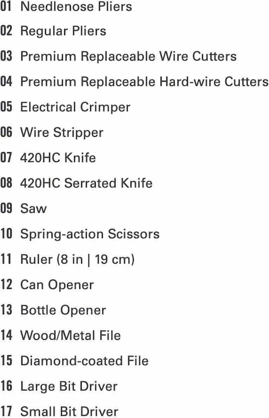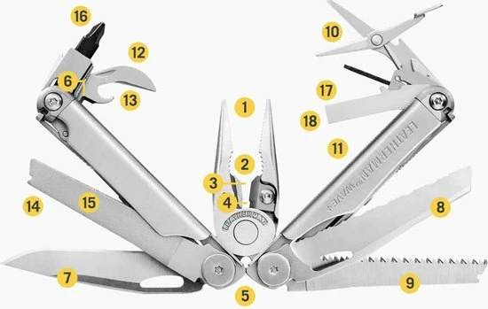 De multitool heeft 18 verschillende tools en dat alles in een compact formaat van maar 10,2 cm. Een multitool die perfect in elk avontuur past.