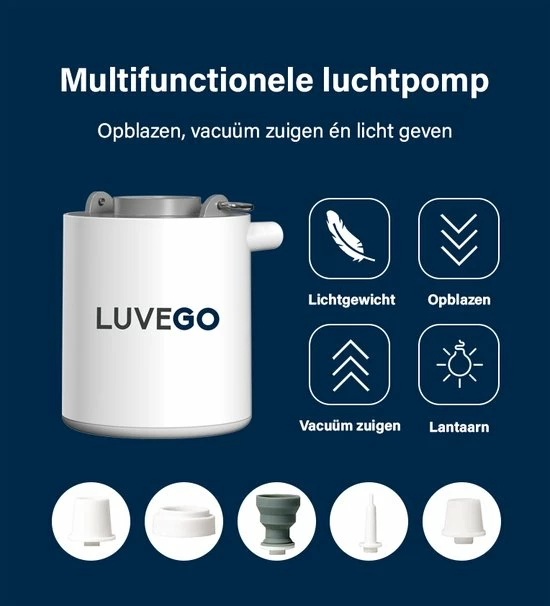 ’S werelds kleinste elektrische luchtpomp. De Luvego MINI PUMP is een pompje welke kracht heeft van een grote zware pomp maar het gewicht van een veertje (89 gram!). dit opblaaspompje is uitermate geschikt voor het opblazen van je luchtbed, bootje, luchtringen, vacuüm zuigen van vacuümzakken, luchtbed leeg laten lopen maar ook als lantaarn in je tent bijvoorbeeld!