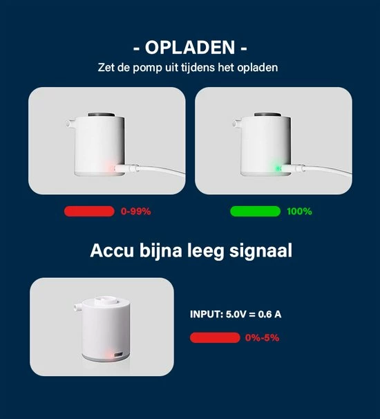 Dit mini pompje pompt 180 liter per minuut met een druk van 3.5kPa. Dit is dus ideaal voor het hard opblazen van een luchtmatras, bootje, luchtringen of het vacuüm zuigen van vacuüm opbergzakken! Met de 5 meegeleverde opzetstukjes welke je gemakkelijk op het pompje aansluit blaas je alles zo op of zuig je alles zo leeg. De MINI PUMP heeft een ingebouwde accu (1300 mAh) welke je oplaadt doormiddel van de gratis meegeleverde USB-C kabel. Op een volle accu lading kan je ongeveer 10 luchtbedden opblazen, 20 vacuümzakken vacuümzuigen, of de lantaarn 10 uur gebruiken op een stand van 40 lumen.