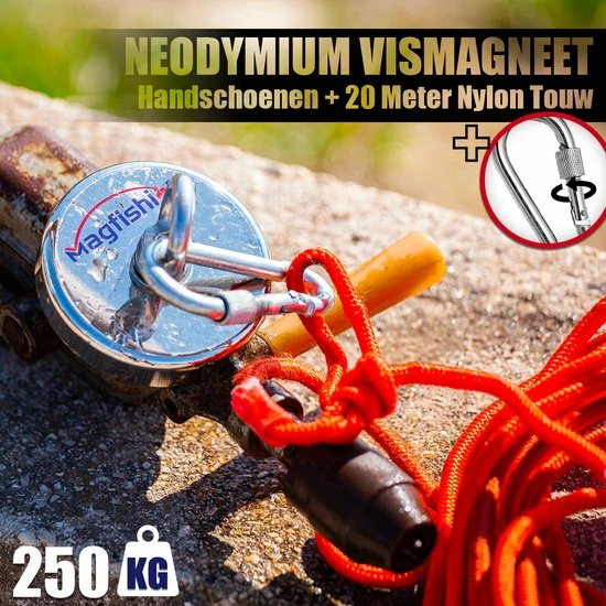 Ga op magneetvis avontuur met deze neodymium vismagneet set van Magfishion! Een complete set met een sterke vismagneet. Deze magneet heeft een diameter van 75mm en een maximale trekkracht van 250 kg. Ook zit er in de set een sterk nylon touw van 20 meter met karabijnhaak, schroefborgmiddel en handschoenen. Dit zodat jij niks tekortkomt tijdens jouw avonturen langs de waterkant.