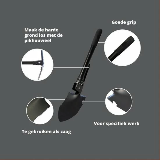 De pioniersschep van Technosafety is voor de echte aanpakker. De schep is ook te gebruiken als sneeuwschep. De schep beschikt over een pikhouweel en een zaagrand. Een pikhouweel is het perfecte stuk gereedschap om sloopwerkzaamheden uit te voeren of om grond los te woelen. Dit maakt de schep onmisbaar voor de echte outdoor avonturiers onder ons! De schep is ook prima te gebruiken als sneeuwschep. Doordat je de schep kan opvouwen, is de schep handig mee te nemen in bijvoorbeeld je rugzak. Handig voor op de camping, langs de waterkant, voor hiking, survival, bushcraft, scouting of andere outdoor activiteiten.