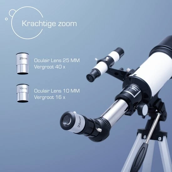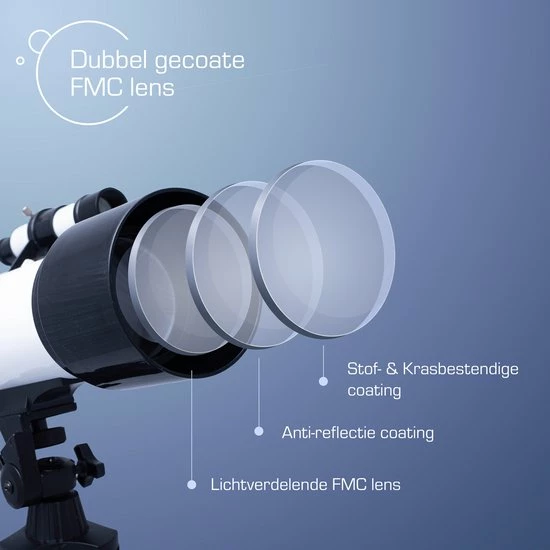 De telescoop is uitgerust met een 3x Barlow-lens en twee oculaire lenzen, 25mm en 10mm. Zodat je een vergroting kunt krijgen van 15 keer tot maximaal 200 keer! Het meervoudig gecoate optisch glas met hoge transmissie zorgt voor verbluffende beelden met extra scherpte en helderheid.