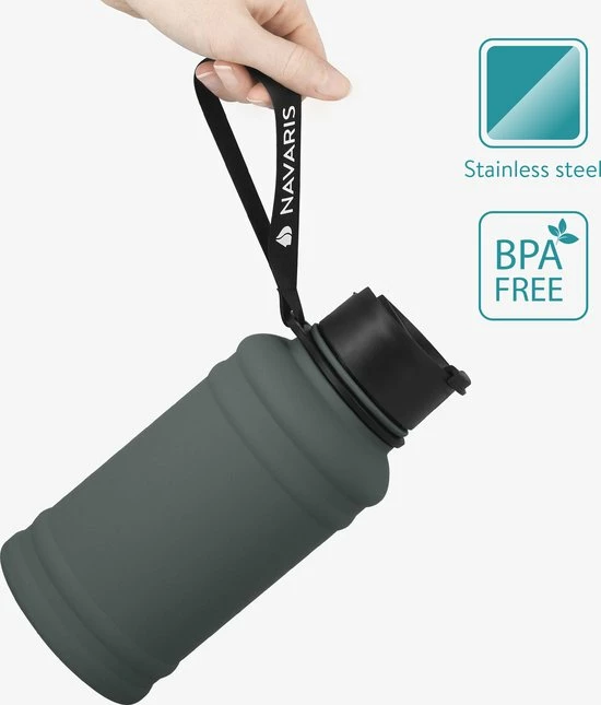 - DETAILS: Deze donkergrijze waterfles is gemaakt van roestvrij staal, vrij van schadelijke stoffen en BPA-vrij. Hij is 22,5 x 10 cm groot en geschikt voor 1,3 liter water of andere dranken. Met zijn 235 g is hij ook nog eens bijzonder licht!