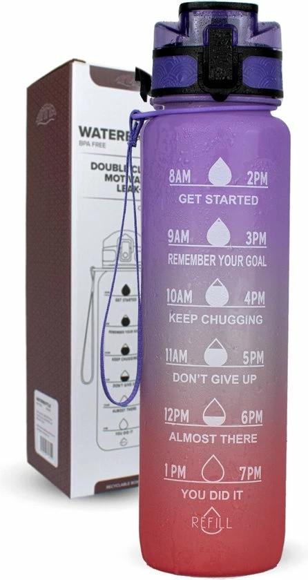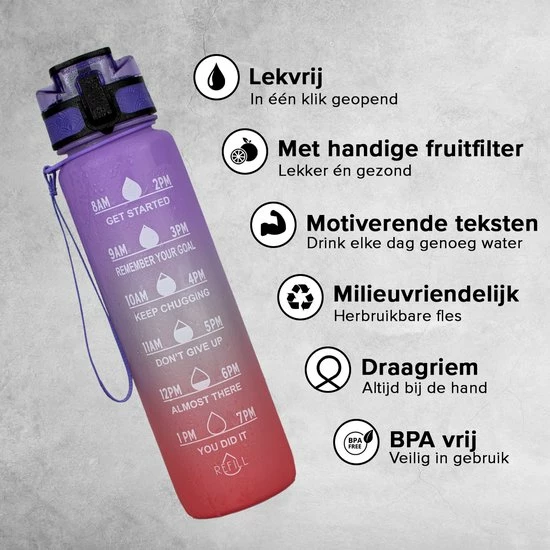Elke dag drinkt 80% van de mensen te weinig water, met de Nimma waterfles is dit verleden tijd! De fles heeft een handige opdruk met de tijden wanneer u het volgende waterniveau moet bereiken. Is de fles leeg? Dan vult u deze opnieuw en gaat de tweede helft in! Er wordt zelfs een fruitfilter bijgeleverd voor een heerlijke variatie aan water smaken!