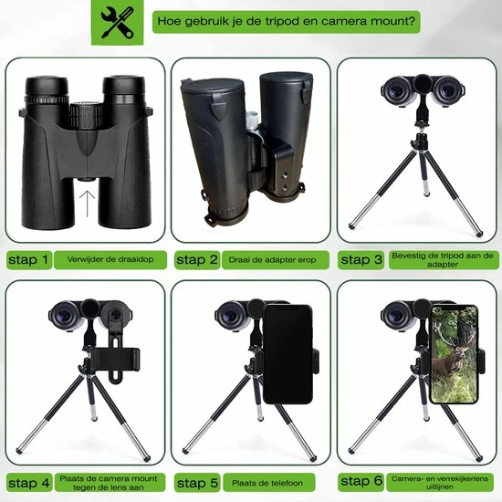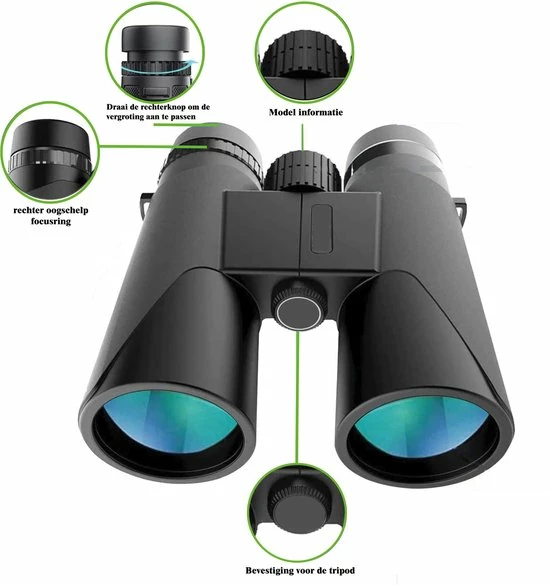 Bij langdurig of intensief gebruik kan je de bijgeleverde Tripod gebruiken om je armen wat rust te geven of gebruik de keycord zodat je het om je nek kan hangen. Op deze manier mis je geen enkele bezienswaardigheid. De verrekijker komt compleet met tripod, keycord, transporttas, telefoonklem, lenskappen en meer zodat je moeiteloos haarscherpe foto’s kan nemen door de verrekijker met 12x vergroting.