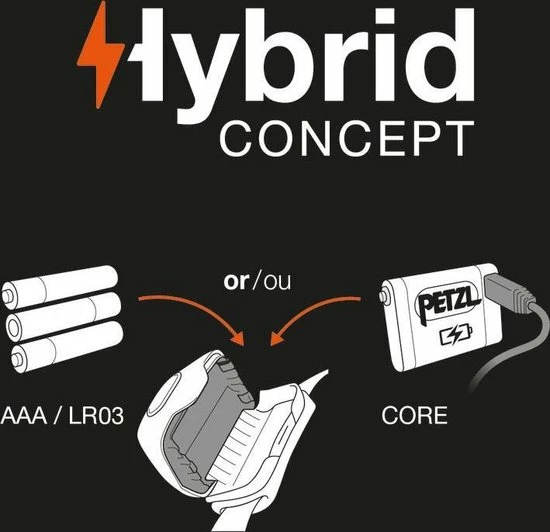 Dankzij het HYBRID-ontwerp kunnen de nieuwe compacte hoofdlampen van Petzl zowel gebruikt worden met de CORE-oplaadbare batterij of met 3 AAA / LR03-batterijen. Een praktische en flexibele oplossing waarmee de gebruiker kan profiteren van elk van deze energiebronnen, afhankelijk van het gebruik. De CORE oplaadbare batterij wordt aangeraden voor frequent tot intensief gebruik. Daar waar de AAA / LR 03-batterijen geadviseerd worden voor minder frequet of incidenteel gebruik.