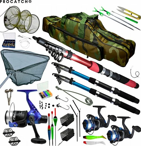 Dankzij de Vishengelset van ProCatch® beschik je over een complete set, waarmee je rechtstreeks naar de waterkant kunt gaan om te vissen! De set van ProCatch® is de perfecte set voor de gevorderde, beginnende of –gelegenheidsvisser en voor iedereen die wil kennismaken met de hengelsport. De ProCatch® hengelset is een ‘ready-to-fish’ set; deze set bevat drie telescopische hengels, visvoer (mais), drie werpmolens, vislijn, onthaker en nog veel meer!