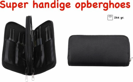 Onze uitgebreide lockpick set bestaat uit 34 onderdelen, waaronder: