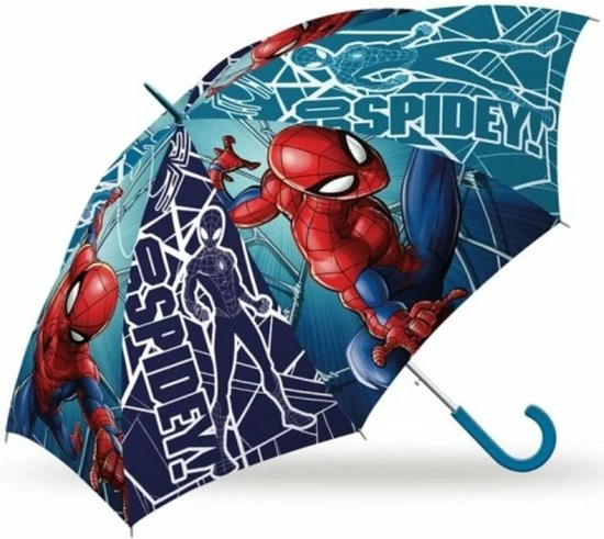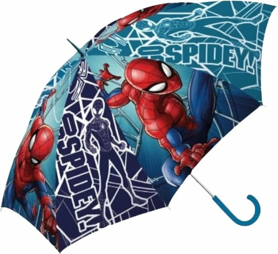 Spiderman Paraplu. Deze stoere paraplu met blauw handvat beschikt over afbeeldingen van Spiderman en beschermt jouw kind tegen de regen. Materiaal: polyester. Diameter: ca. 41 cm. Regenkleding en accessoires voor kinderen – Paraplu voor kinderen – Spiderman – Spidey.