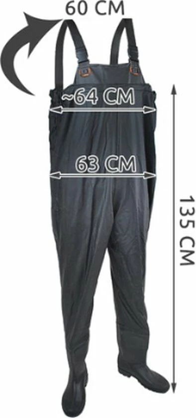 Dit waadpak is ontzettend gebruiksvriendelijk en van hoge kwaliteit. De waterdichte broek is gemakkelijk over de normale kleding aan te trekken. Het PVC pak is uitgerust met hoge kwaliteit rubberen lieslaarzen met een stevige anti-slip zool. De eenvoudig verstelbare schouderbanden zorgen ervoor dat de broek naar eigen wens verstelbaar is. De maat van het pak doelt op de schoenmaat van de laarzen, het waadpak is een one-size-fitt-all.