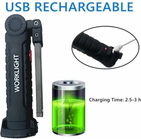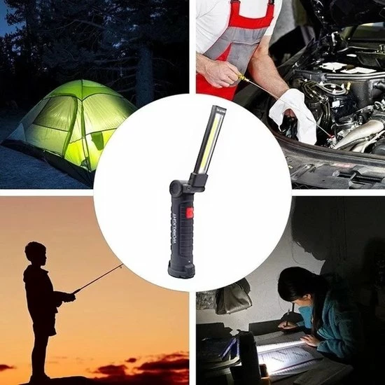 De 360 graden rotatie maakt de lamp veelzijdig inzetbaar. Dankzij de magneetfunctie en haak zijn uw handen vrij wanneer u een specifieke plek wilt verlichten. Ideaal voor autoreparaties, verlichting thuis, kamperen, wandelen, stroomuitval. De lamp wordt geleverd met micro-USB kabel.