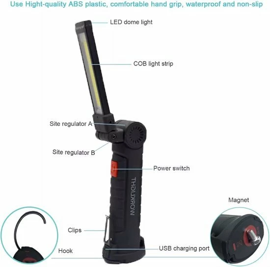 Deingebouwde oplaadbare batterij is oplaadbaar via USB-poort (meegeleverde USB-kabel). De LED werklamp beschikt over 5 verlichtingsmodi: hoge helderheid, gemiddelde helderheid, voorlicht, rood waarschuwing, flitsrood, ideaal voor het repareren van auto’s buitenshuis.