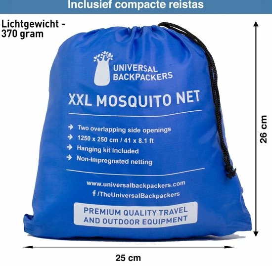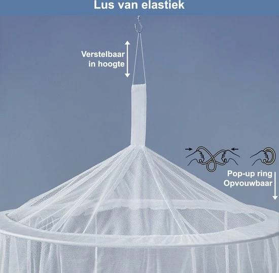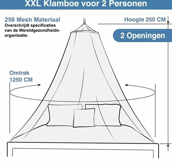 Bescherm jezelf tegen muggen en andere insecten welke mogelijk ziektes dragen zoals malaria, Zika en Dengue. Dit muggennet heeft twee openingen, wat het in en uit bed stappen extra makkelijk maakt. Naast bescherming tegen insecten en muskieten creëert de klamboe een luxe uitstraling in je slaapkamer. De klamboe heeft een goede aansluiting op een tweepersoonsbed (of kingsize). Bij een eenpersoonsbed adviseren we de onderrand van het net goed onder de matras te stoppen. Een muggennet met een pop-up ring is voor ieder persoon eenvoudig te installen en daardoor uitermate geschikt voor verre reizen, kamperen en backpacken. Je kunt dit product als reisklamboe gebruiken of als luxe decoratie in de slaapkamer. Wees elke mug de baas met deze eenpersoons / tweepersoons mosquito net.