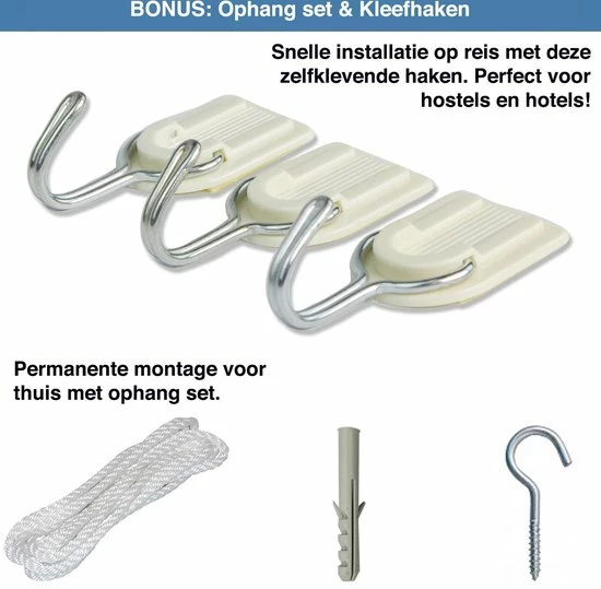 De muskietennetten van Universal Backpackers worden geleverd inclusief complete bevestigingskit, bestaande uit een schroefhaak, een spijker en touw. Maak boven je bed een bevestigingspunt of span horizontaal boven het bed een touw waaraan de klamboe vastgemaakt kan worden.