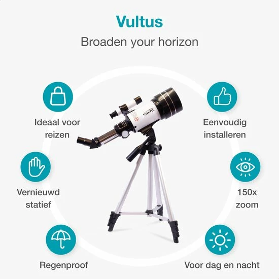 Met deze voordelige Vultus telescoop kun je vanaf nu niet alleen de ruimte, maar ook het landschap op een verbluffende manier bezichtigen! Dit in combinatie met de prijs maakt dat deze telescoop ook ideaal is om cadeau te doen aan kinderen of beginners. Naast de prijs en de verbluffende beelden brengt deze telescoop nog veel meer voordelen met zich mee…