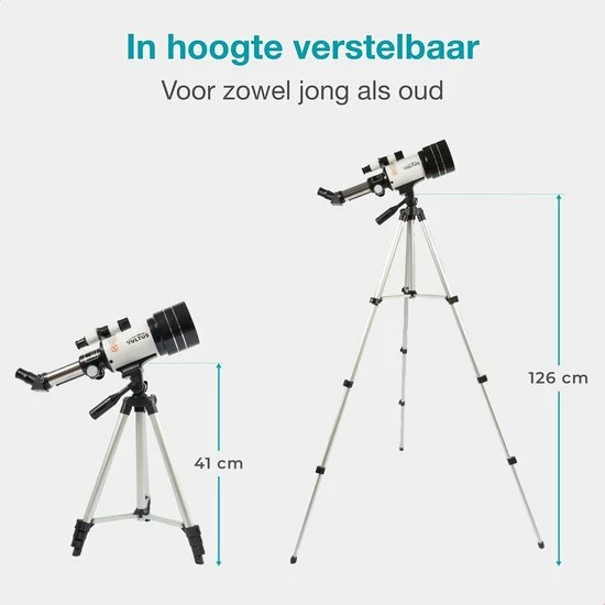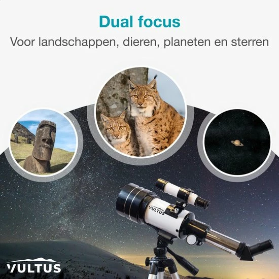 Het wordt avond, de wereld sluit, maar voor jou begint het nu pas. Wat speelt er zich allemaal af in die wereld boven ons? Je pakt je telescoop erbij, kijkt door de lens en ziet de maan, sterren en allerlei andere objecten die je vooraf alleen in je gedachte kon zien. Wist jij dat de maan wel 14 tot 37 procent kan verschillen in grootte vanaf de aarde? Ontdek het vanaf nu allemaal met deze voordelige Vultus telescoop.