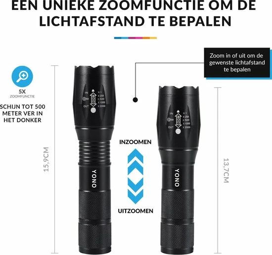 De YONO militaire zaklamp is een veelzijdige zaklantaarn met verschillende functies. Met de zoomfunctie kan je de lichtafstand bepalen. De sos-functie maakt het mogelijk om het licht te laten flikkeren als een stroboscoop. Doormiddel van de knop aan de achterkant kan je de verschillende lichtsterktes bepalen.